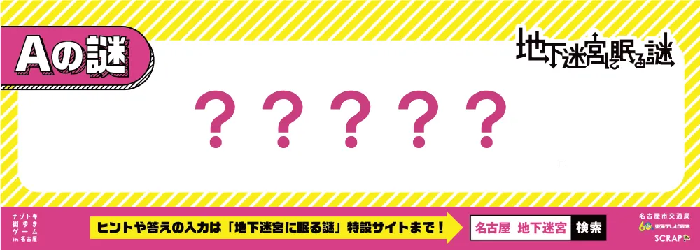 株式会社 SCRAP(所在地:東京都渋谷区、代表者:加藤隆生)と東海テレビ放送(所在地:愛知県名古屋市、代表者:内田優)、名古屋市交通局(所在地:愛知県名古屋市)は、共催イベントである"ナゾトキ街歩きゲーム in 名古屋"「地下迷宮に眠る謎」の開催を記念して、4月1日(日)~4月30日(月祝)の期間限定で地下鉄 名城線の車両内をジャックし、6種類の<謎>を掲出した「地下迷宮に眠る謎」特別列車を運行いたします。