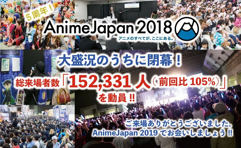 5周年を迎えた『AnimeJapan 2018』は、過去最多の総来場者数152,331人(前回比105%)を動員し、『ファミリーアニメフェスタ2018』は来場者数14,304人(前回比122%)を記録し、大盛況のうちに閉幕しました。