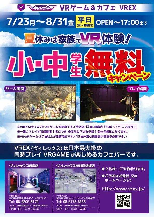 株式会社フタバ図書(本社:広島市西区、代表:世良 與志雄)は、最新のVR(ヴァーチャル・リアリティ/仮想現実)体験と飲食ができるレストラン「VR Game&Cafe Bar VREX(ヴィレックス)」渋谷宮益坂店、新宿店にて、2018年7月23日(月)~2018年8月31日(金)の期間中、小中学生を対象にVR体験を無料で行えるキャンペーンを実施いたします。