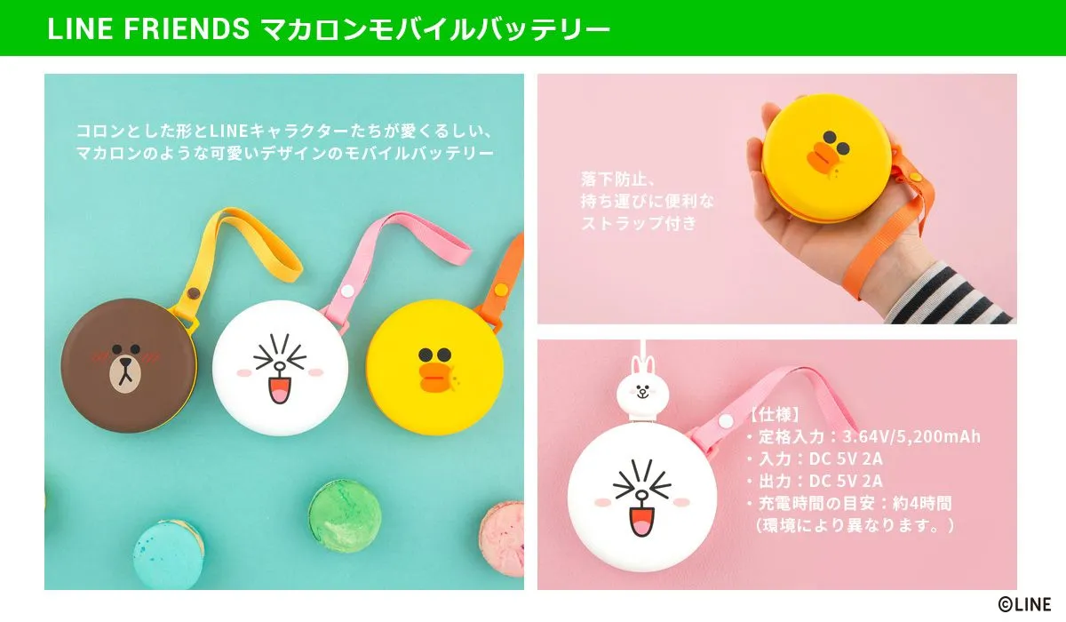 本製品は、「LINE FRIENDS」がモチーフのコロンとした姿が愛くるしい、マカロンルックなモバイルバッテリーです。キュートなイラストで楽しく充電できます。