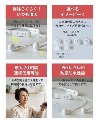 イヤホン部が球体で凹凸はなく、耳垢がたまりせん。 汚れても簡単に拭くことができるので、常に清潔に保つことができます。