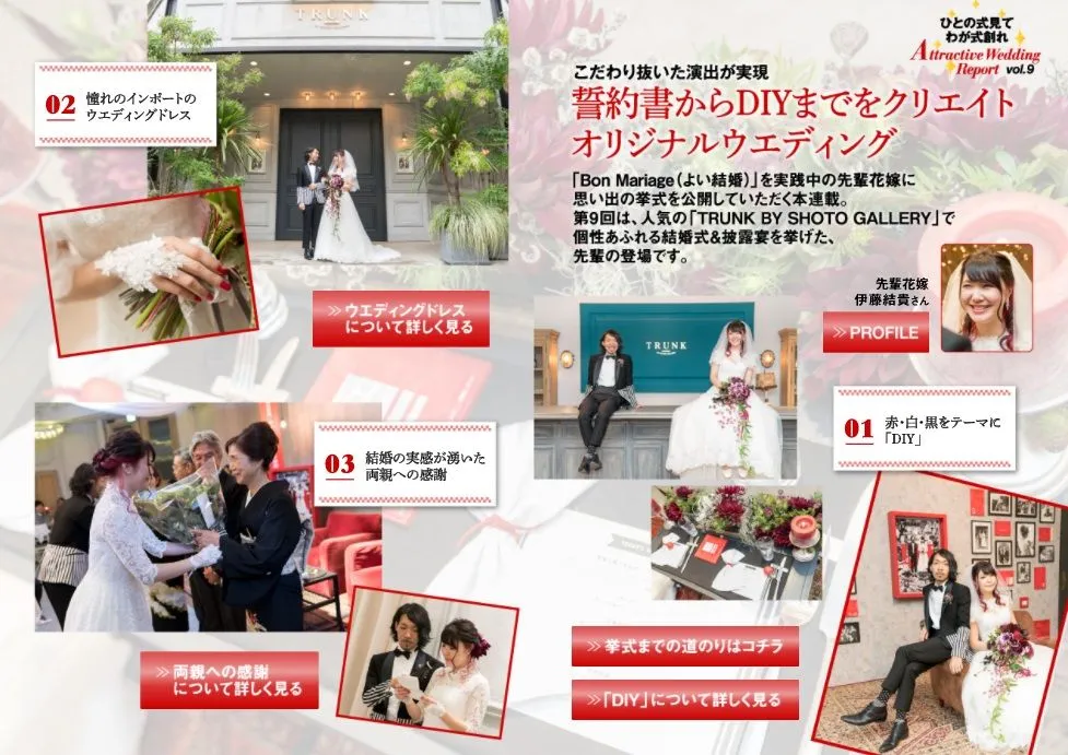先輩花嫁の実例集・第9回は、人気の「TRUNK BY SHOTO GALLERY」で挙げた、個性溢れる結婚式をご紹介。赤・白・黒をテーマに、内装や装飾品はすべてDIY。ウエディングドレスはインポートをセレクトし、二次会のドレスは手作りという、まさに自分たちならではのオリジナルウエディングを実現した好例です。
