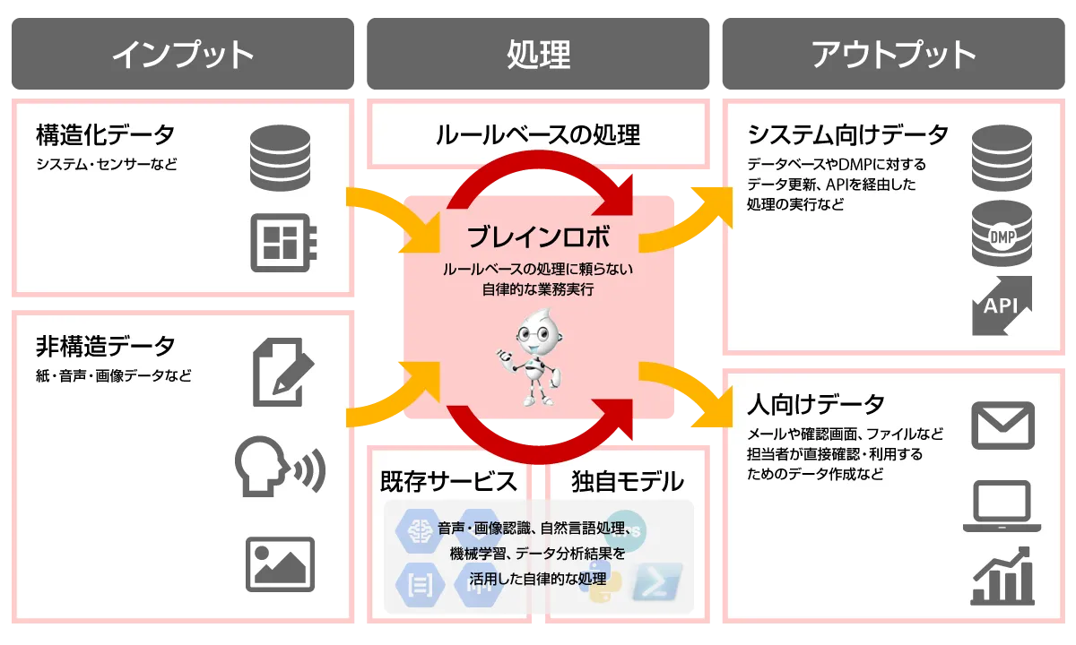「ブレインロボ(BrainRobo)」は、RPAの基本機能であるルールベースの業務処理にとどまらず、画像認識・音声認識などに代表されるAI(人工知能)や機械学習との連携により、高度な業務処理を実現するソリューションです。