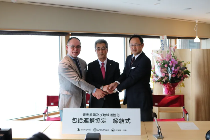 北海道上川町(以下「上川町」)と、株式会社スノーピーク(本社:新潟県三条市、代表取締役社長:山井 太、以下「スノーピーク」)、上川大雪酒造株式会社(本店所在地:北海道上川町、代表取締役社長:塚原 敏夫、以下「上川大雪酒造」)は、2018年4月3日「観光振興および地域活性化に関する包括連携協定」を締結し、協定締結式を実施しました。