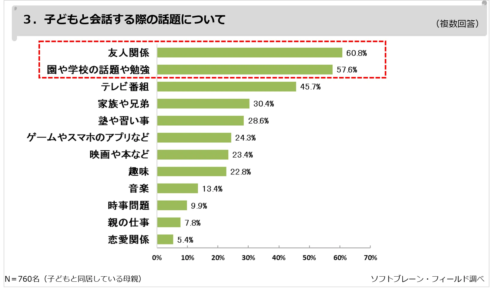 話題については、「友人関係について」がもっとも多い60.8%、次いで「幼稚園・保育園、学校などの話題や勉強について」が57.6%であり、普段子どもが生活している環境の中で、誰とどんな風に過ごしているか、どんなことがあったのかを聞き、子どものことを理解したいという気持ちがうかがえました。