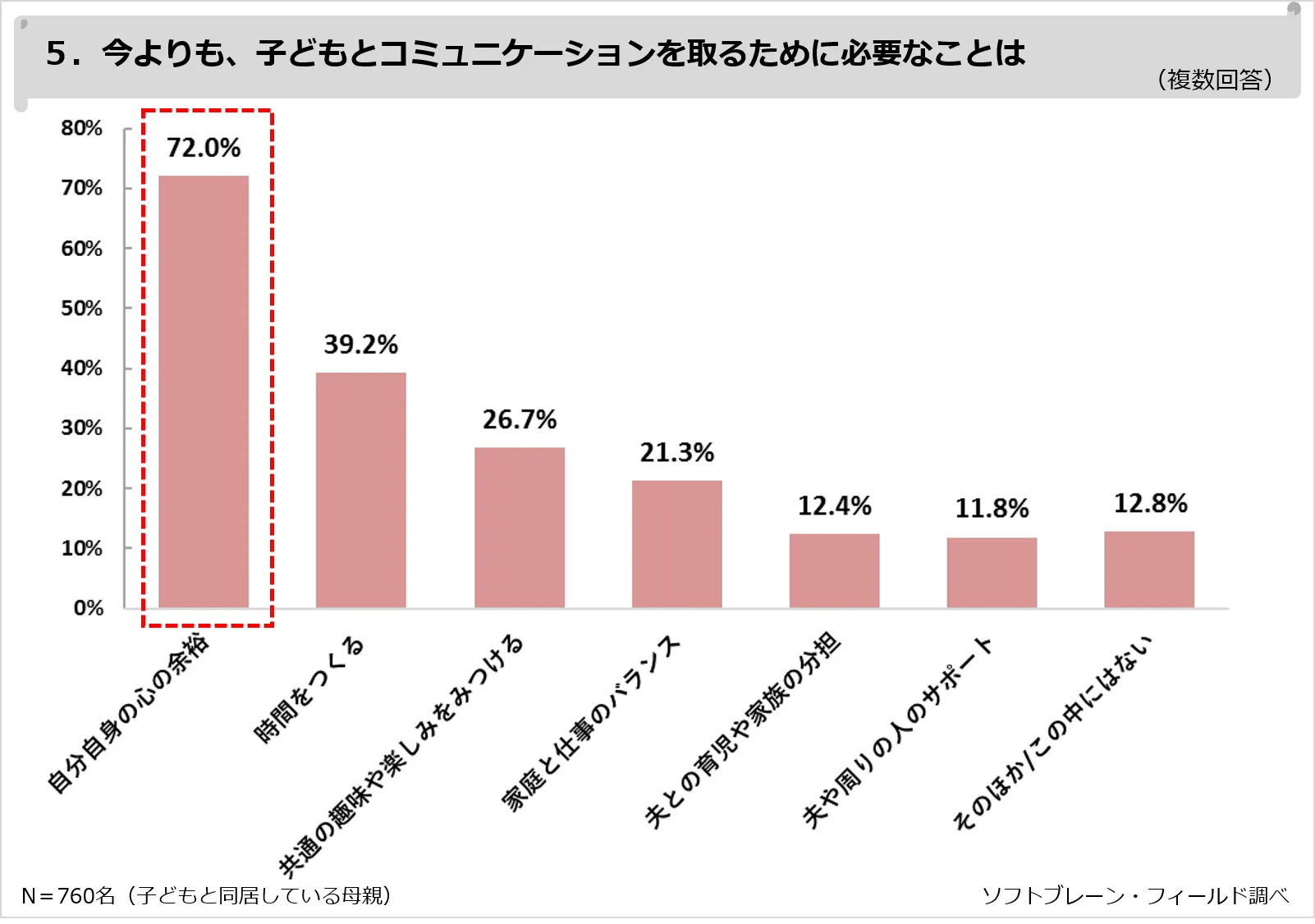 今よりも、子どもとコミュニケーションを取るために必要なことは、「自分自身の心の余裕」が72.0%と圧倒的で、多くの方が感じているようです。次いで「時間を作る」が39.2%、「共通の趣味や楽しみをみつける」が26.7%でした。