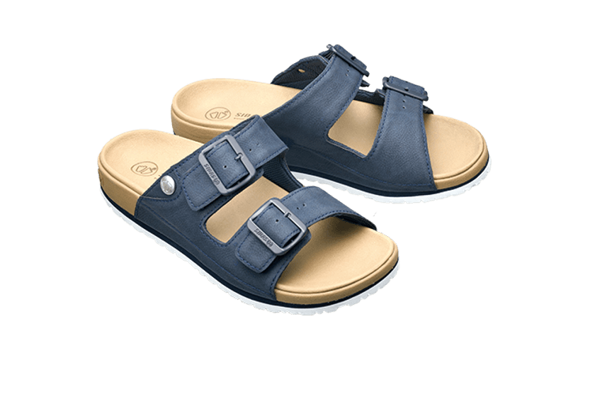 脱ぎ履きが楽なスリップオンタイプ。ダブルストラップが足にフィット。