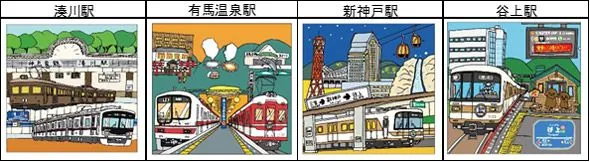 乗り物イラストレーターの井上広大(いのうえ こうだい)氏の描いた、湊川駅、有馬温泉駅、新神戸駅、谷上駅の4枚のイラスト硬券が入っています。神戸電鉄と北神急行電鉄で発売する台紙は異なります。両社の台紙はひとつのイラストに繋がるようになっています。これは両社が谷上駅で接続し、永遠に走り続け、地域のお客様や鉄道ファンに長く愛されることを願ってのデザインとなっています。