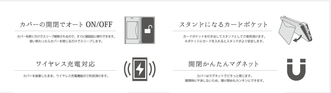 ケースを開くとiPhone Xがスリープ状態から復帰し、閉じるとスリープ状態に戻ります。一枚合皮でスリム且つ高級感のある仕様。内側にスタンドにもなるカードポケット付き。ワイヤレス充電にも対応しています。