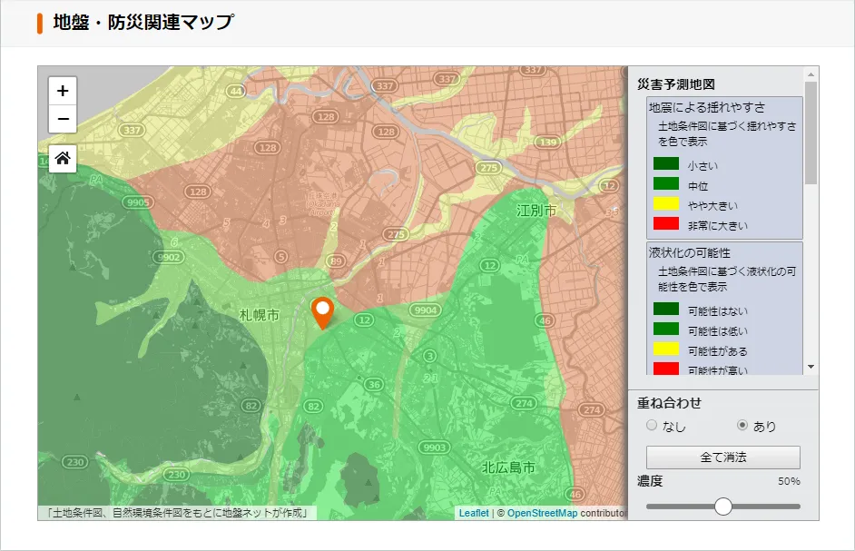 物件周辺の地盤・防災等の情報として、各空き家の詳細ページにハザードマップを追加しました。これにより空き家周辺の地震による揺れやすさ、今後の地震予測、液状化・浸水の可能性等の不動産選びに欠かせない防災情報をその地域に詳しくない方でも視覚的に確認することができます。