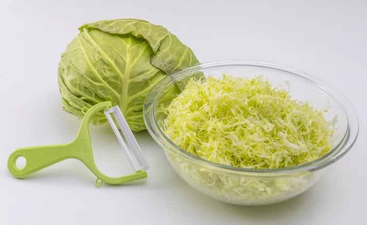 セラミックワイドピーラーは、野菜の皮むきはもちろん、セラミック刃のシャープな切れ味とワイドな刃面積で、包丁・まな板を使わずに、きめ細かででみずみずしいせん切りキャベツを簡単に調理していただけます。