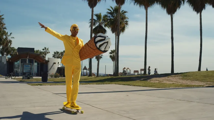 大きなヨーロピアンシュガーコーンを持って陽気にスケボーに乗って登場する謎の男