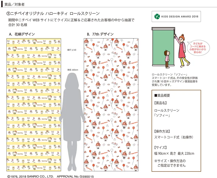商品開発テーマに【環境・健康・高齢化・省エネ・安全】を掲げ、さまざまな窓まわり商品の安全対策を発表してきたニチベイの“使う人の安心・安全”を願う思いを、ハローキティがいろいろな形で伝えていくニチベイ× ハローキティ コラボレーション。今回は、ニチベイ創業77周年を記念し、感謝の気持ちを込めて2種類のデザインから選べる「ニチベイオリジナルハローキティ ロールスクリーン スマートコード式」を抽選で合計30名様にプレゼント。さらに「ニチベイオリジナル ハローキティ ランチトートバッグ」が合計2,000名様に当たるキャンペーンを実施いたします。
