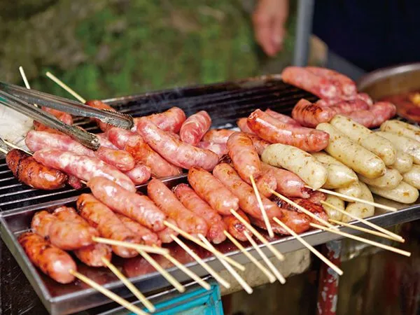 香腸(シャンチャン)は、肉を腸詰めにした、いわゆるソーセージのことで、見た目は日本のものと変わりません。ただし、少し甘みのある味付けがされています。この甘みが苦手という日本人も多いようですが、粗挽きのお肉はジューシーで食感も良く、ハマる人にはハマるグルメです。屋台では串に刺した状態で売られていることが多く、食べ歩きに向いています。