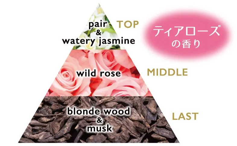 SPF50+ PA++++。ウォータープルーフタイプ。香水ライクなティアローズの香り。