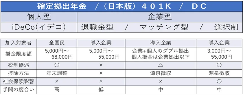 確定拠出年金は、iDeCo(イデコ)のような個人型と企業型(退職金型・マッチング型・選択制)に大別され、次のような違いがあります。