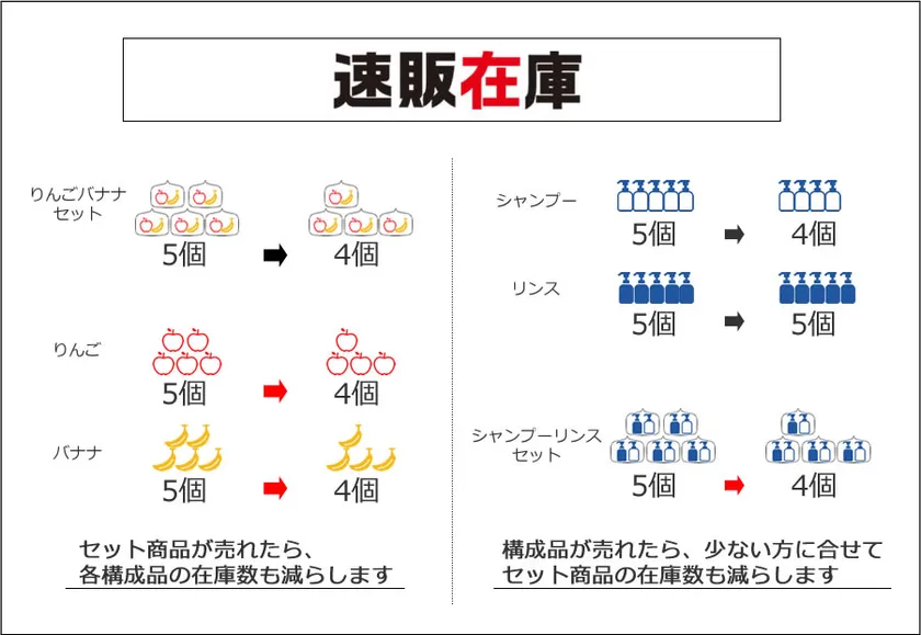 今回、「速販在庫」に「セット商品」機能を追加し、セット商品と構成品の在庫数を連動させることができるようにしました。