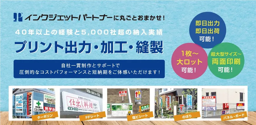 株式会社アライデザイン工芸(本社:静岡県浜松市、代表取締役:新井 和美、以下 当社)は、屋内外の大型幕やバナー、フラッグ、各種看板用の素材へのプリント出力と加工に特化した『インクジェットパートナー』をオープンし、2018年4月にサービスを提供開始いたしました。
