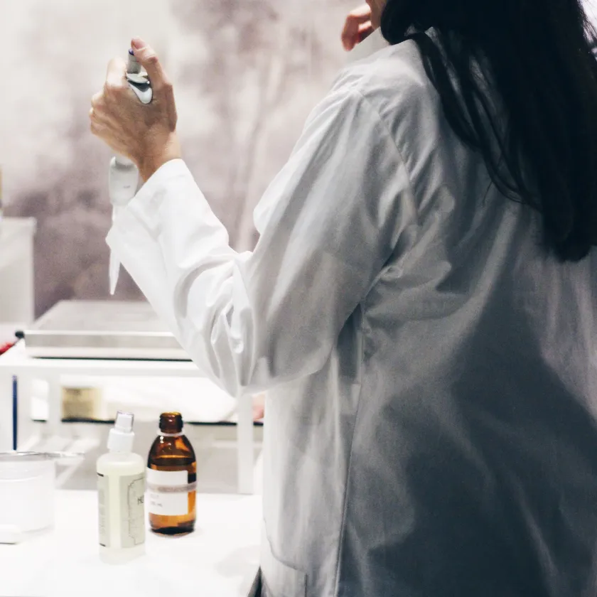 いよいよ白衣に着替えてラボで調合します。ステップ:1で出会った香りを専用の器具を使用して無香料のコスメと融合させます。実験しているかのような不思議体験をお楽しみいただけます。