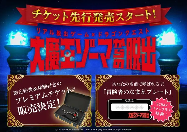 株式会社SCRAP(所在地:東京都渋谷区、代表者:加藤隆生)と株式会社スクウェア・エニックス(所在地:東京都新宿区、代表取締役:松田洋祐)の「ドラゴンクエスト」シリーズとのコラボレーションイベント「大魔王ゾーマからの脱出」において、特典付きのプレミアムチケットの発売決定を含めるイベントの詳細情報を公開し、本日4月5日(木)正午12時よりチケットの先行発売をスタートいたします。