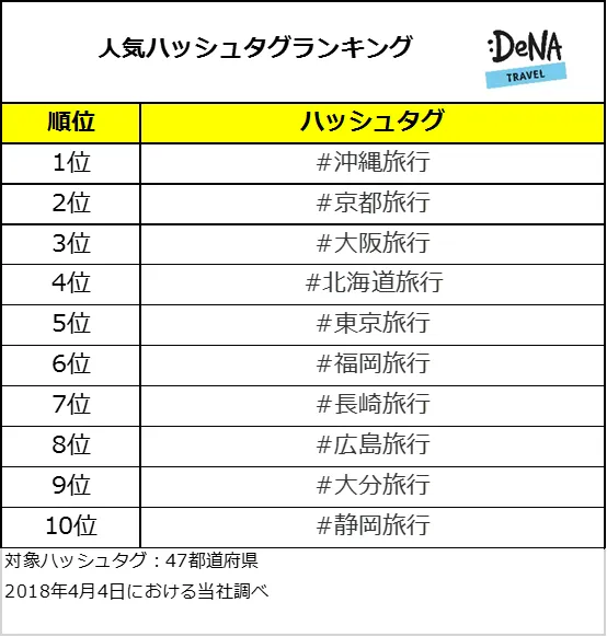 オンライン総合旅行サービス「DeNAトラベル」(URL:http://www.skygate.co.jp/)を運営する株式会社DeNAトラベル(本社:東京都新宿区、代表取締役社長:大見 周平、以下DeNAトラベル)は、Instagramにハッシュタグ「#○○(都道府県名)旅行」で投稿された投稿数を基に「インスタ映え」で注目を集める国内旅行先を調査しました。