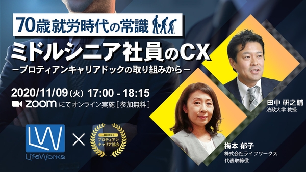 本セミナーでは、キャリア自律の最新理論プロティアン・キャリアの第一人者 田中研之輔教授と、ミドルシニア社員を中心とする14万人を対象にキャリア支援を行ってきた立場からライフワークス代表 梅本郁子が講演します。その後、クロストークを通して多様化・複雑化するミドルシニア社員のキャリア課題にどう向き合うかを、紐解いてまいります。
