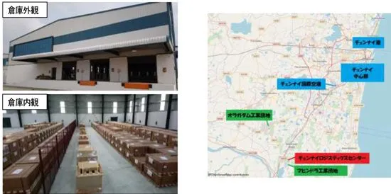 新倉庫は、チェンナイ国際空港から32km、チェンナイ港から64km、自動車産業が集積し日系企業も多数進出しているマヒンドラ工業団地やオラガダム工業団地にも至近です。