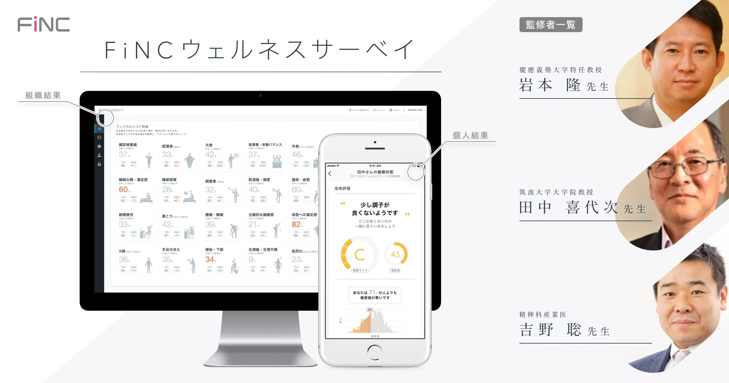 FiNCウェルネスサーベイは、従業員の心身の健康を、「フィジカル・メンタル・エンゲージメント」の3つの要因に分解し、それぞれの状態をスコア(数値)にして可視化することで、従業員の心身の健康状態を正確に把握することができるツールです。また、可視化されたリスク要因(生産性低下やメンタルヘルス不調等の要因)を分析し、改善アドバイスも行います。各分野の第一人者であり、最新の知見を有する専門家である慶應義塾大学大学院 特任教授 岩本隆氏、筑波大学大学院 スポーツ医学専攻教授 田中喜代次氏、精神科産業医 吉野聡氏が監修しています。