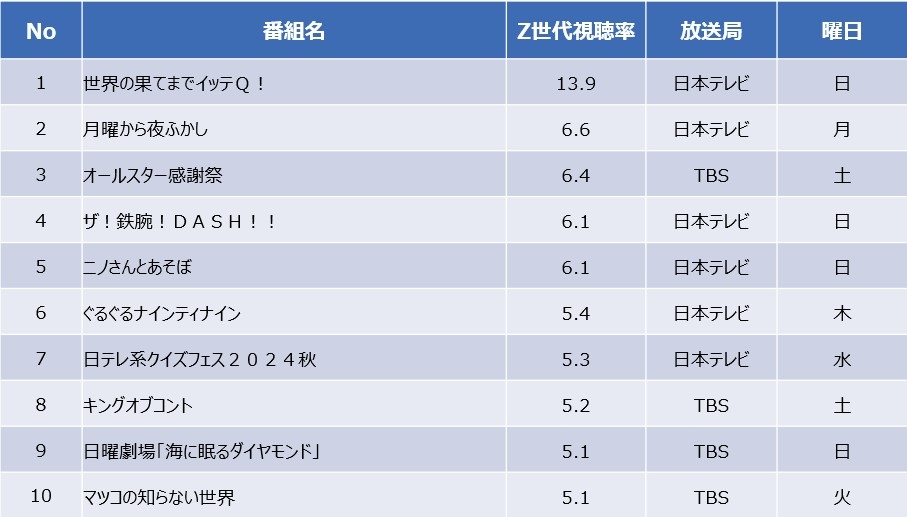 1位に輝いたのは全世代と同じく、日本テレビ系列のバラエティ番組「世界の果てまでイッテQ!」で13.9%。XではZ世代と思しき方々が、手越祐也さんの出演を歓迎しているつぶやきが複数見られました。
