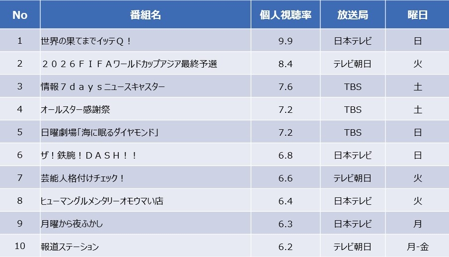 全世代平均で1位に輝いたのは日本テレビ系列のバラエティ番組「世界の果てまでイッテQ!」(毎週日曜日19時58分~20時54分)で、9.9%の視聴率を誇りました。