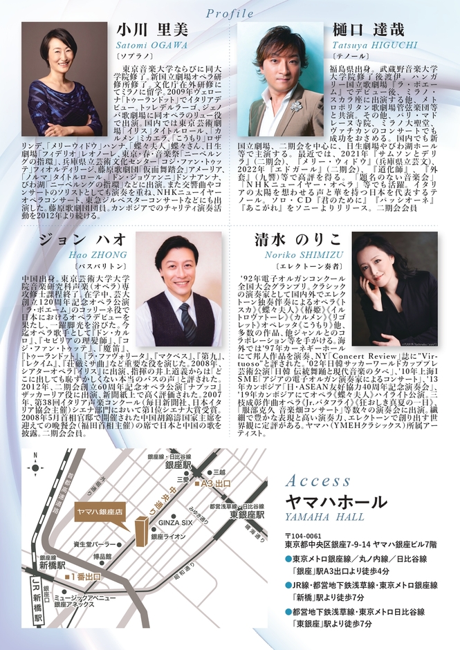 ソプラノは銀座オペラの華、小川里美、テノールには国内外でプリモテノールとして活躍し続ける樋口達哉氏、深い音楽性と美しい声で観客を魅了するジョンハオ、そして銀座オペラになくてはならない孤高のエレクトーン奏者清水のりこが華やかな音楽の一夜をお送りします。