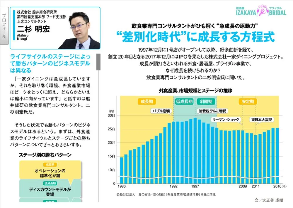 東京・千葉・埼玉に居酒屋を展開する株式会社一家ダイニングプロジェクトを特集。2012年からはブライダル事業にも参入し、東京タワーの真下に「The Place of Tokyo」を構えて急成長。2017年12月にはマザーズ上場も果たしました。一見、ベクトルの異なる業態でありながら、その根底には同社が20年かけて培ってきた“おもてなし力”が流れています。代表取締役社長・武長太郎氏のインタビューをはじめ、居酒屋の店舗開発やブライダル事業の責任者から事業拡大の秘密を探るほか、斜陽と言われる外食業界で同社が成長し続けているポイントを飲食コンサルタントに聞きました。