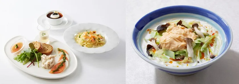 左:Chef’s Palette「PaletteLunch“SOY”」、右:中国料理古稀殿「豆乳クリームかけ 辛味野菜汁そば」