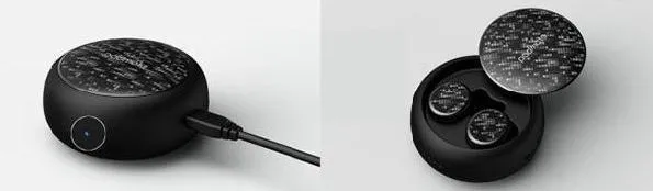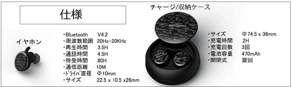チャージケースは、イヤホンを充電すると共に、収納ケースとしても機能します。最大3回分のイヤホンチャージができ、10時間以上使用可能です。