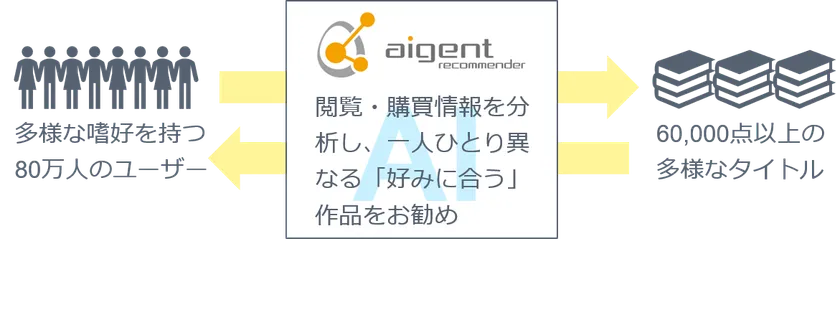 シルバーエッグ社独自のAI技術を使ったレコメンドエンジンは、80万人の会員ユーザーの作品閲覧・購入行動を分析し、60,000以上の作品の中から一人ひとりの「好み」に合った作品をリアルタイムで表示します。画一的になりがちだった「おすすめ作品」の内容をパーソナライズすることで、多様な嗜好を持ったユーザーが「いま、読みたい」と思える作品と出会える機会を増やし、ファンとクリエイターを結ぶ『まんが王国』のサービスに貢献します。