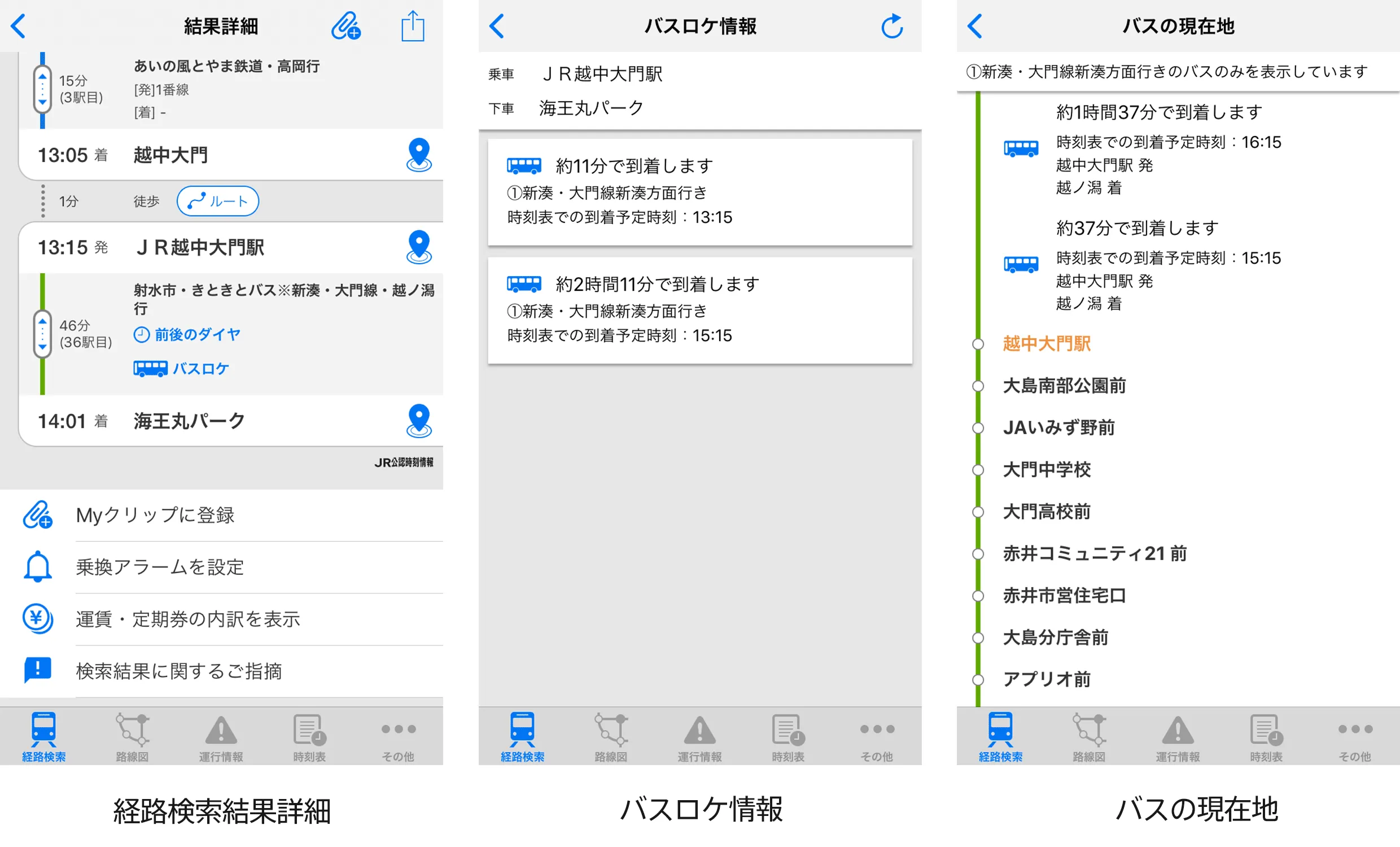 「駅すぱあと」アプリで経路を検索し、検索結果に射水市コミュニティバス「きときとバス」が含まれる場合に、アプリ内に「きときとバス」の現在地や到着予想時間、遅延分数などが表示されます。