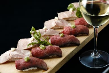肉の旨みをお寿司で楽しむ肉寿司。香草や香辛料でじっくりとマリネした豚肩ロースの自家製ハムに加え、ディナーにはローストビーフの肉寿司も登場。