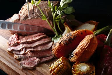 低温で丁寧に火を通すことで、肉の旨みを閉じ込めた国産牛のローストビーフを目の前でカッティングしてご提供いたします。