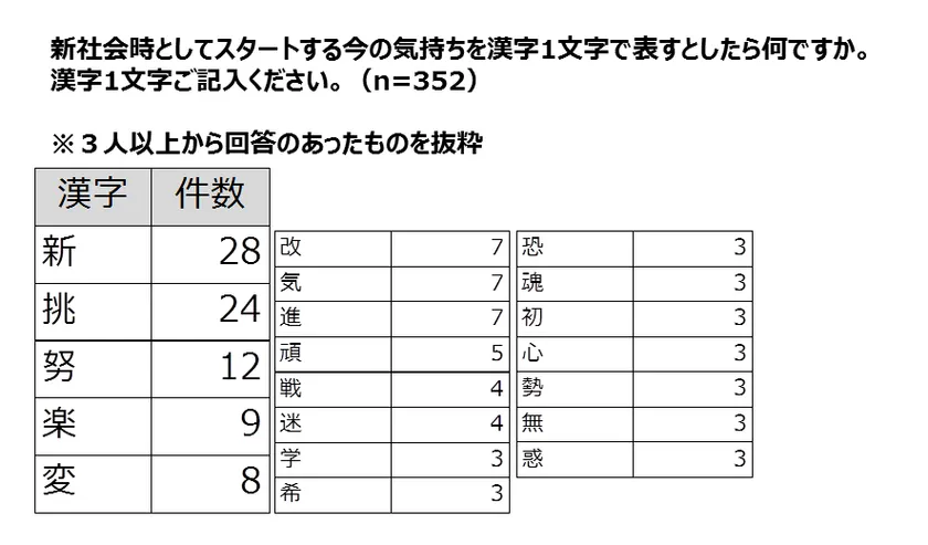 ・今の気持ちを漢字1文字で表してもらったところ、110の漢字の回答がありました。1位「新」(28人)、2位「挑」(24人)、3位「努」(12人)とポジティブな気持ちを表す漢字が目立ちました。(図表1)
