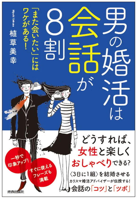 この本では、「2日に1組を結婚させる」というカリスマ婚活アドバイザーである植草 美幸さんが、その豊富な経験と実績に基づいて、婚活会話のコツとツボをアドバイスしています。