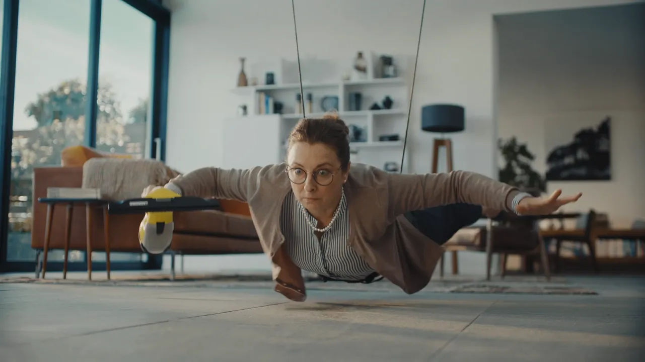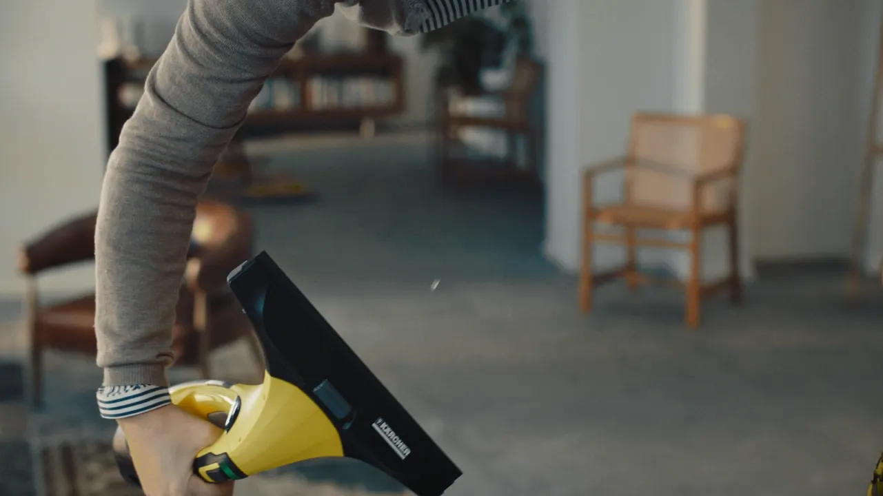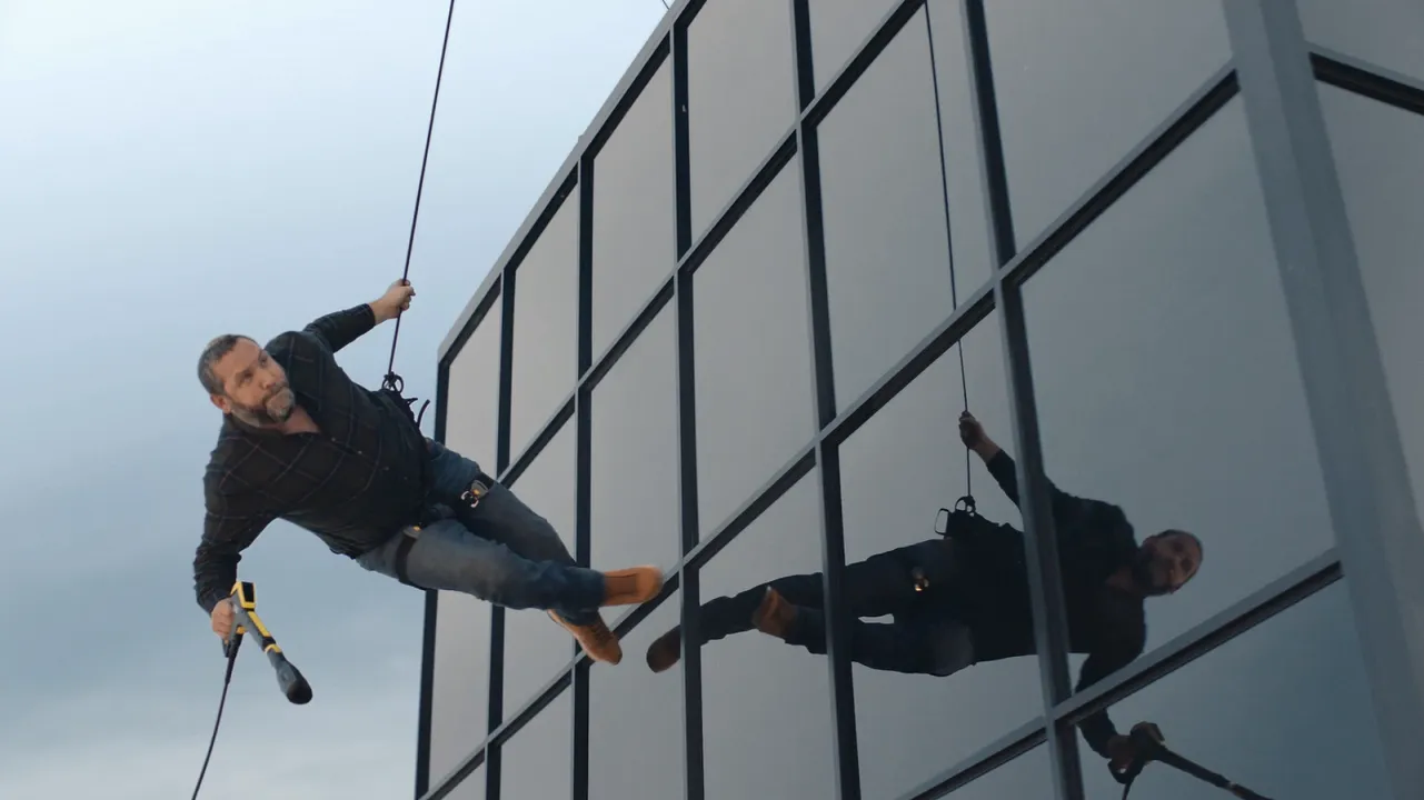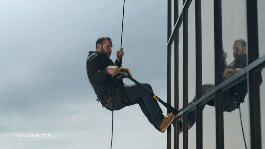 「窓用バキュームクリーナー」篇では窓用バキュームクリーナーを持った女性が水滴を落とさずに窓掃除に、「高圧洗浄機」篇では高圧洗浄機を持った男性がビルの側面の汚れ落としに挑戦します。