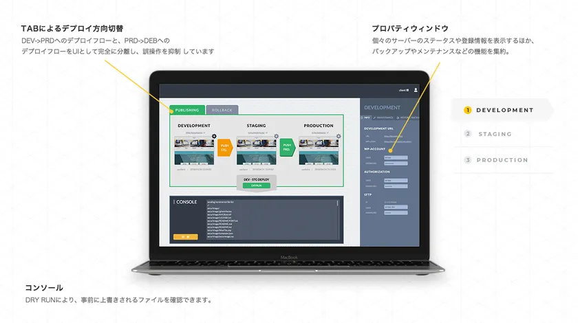開発・ステージング・本番の3環境を分離した運用についても、専用管理画面による状態確認、簡単操作で各環境間のコンテンツ同期、WordPress本体のバージョンアップやプラグインの管理が行えますので、ストレスフリーな開発、安全なサイト公開を実現できます。