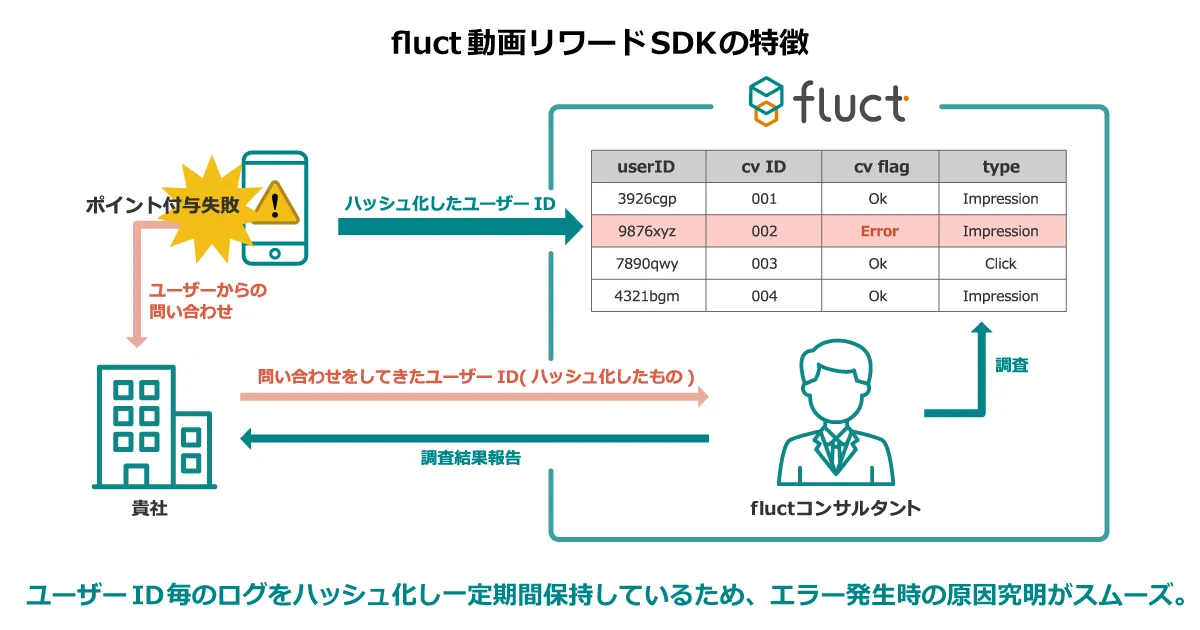 メディエーション機能を持つ従来の動画リワードSDKでは、報酬付与が失敗した際や、アドネットワークのSDKがクラッシュした際、原因となるアドネットワークの特定が難しく、原因究明やサポートに大きな課題がありました。fluctでは、ユーザーID毎のログをハッシュ化し、一定期間保持することで、スムーズ且つ迅速な原因究明を可能にしました。