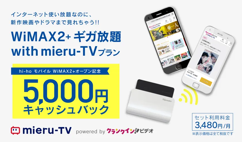 株式会社ハイホー(本社:東京都千代田区、代表取締役:鈴木 武人)は、2018年4月23日から、月間のデータ通信量に上限がなく(※1)、通信速度制限(月間7GB超)が適用されないWiMAXギガ放題プランと、株式会社ZITTO(本社:東京都新宿区、代表取締役社長:山田 哲夫、以下 ZITTO)が運営する動画オンラインレンタルサービス「mieru-TV」をセットプランとした「hi-ho モバイルコースWiMAX2+ギガ放題 with mieru-TV」(以下、本サービス)を実質月額3,480円(※2)でサービス提供いたします。