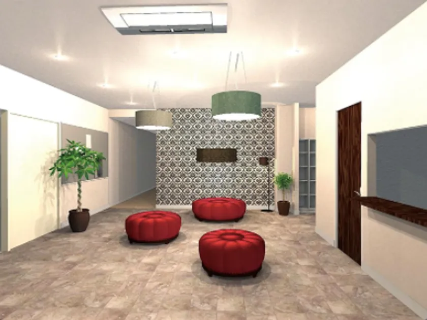 女子学生寮の入口となるエントランス部は、華やかなエントランスを演出しつつ、 線を邪魔しないラウンドタイプのソファベンチを配置しています。