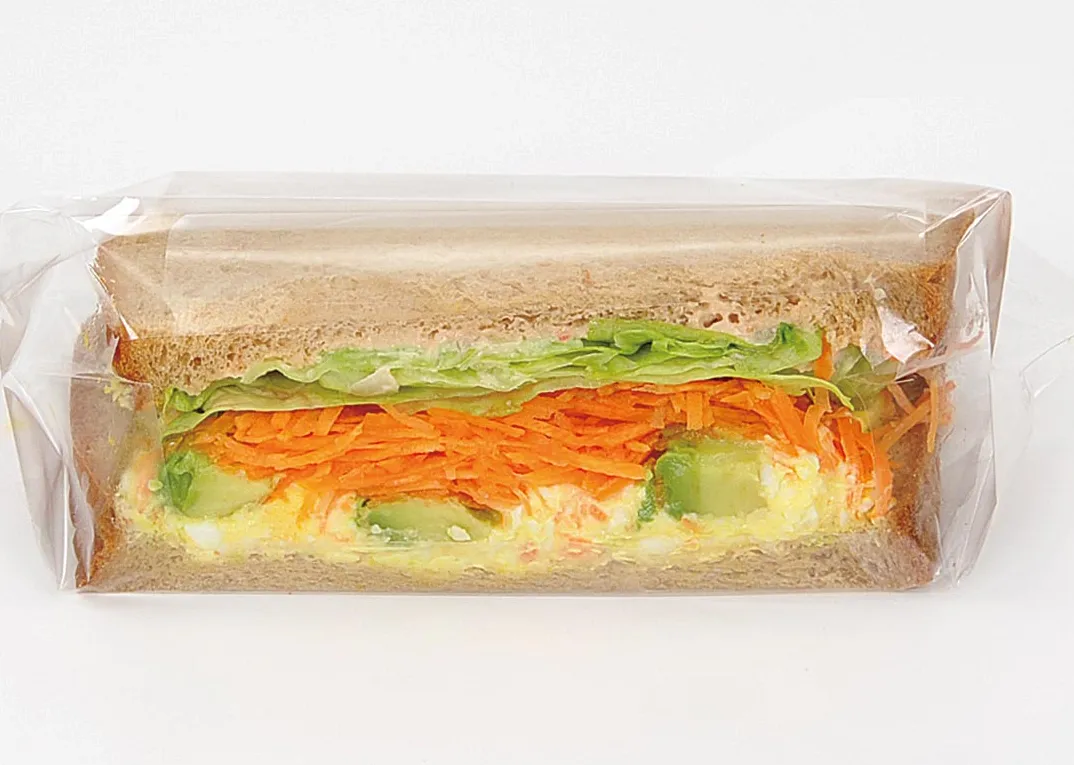彩り豊かな野菜のサンドイッチです。アボカド、人参、レタス、たまごサラダに、オーロラソースを組み合わせ、全粒粉の食パンに挟みました。