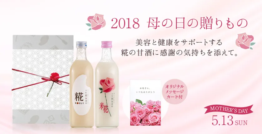 いつまでも綺麗で元気でいて欲しいお母さんへの贈り物として、糀の甘酒にオリジナルメッセージカードをつけた母の日限定ラッピングのギフトセットを用意しました。また期間中は通常、有料のお写真プリントサービスを無料で実施いたします。離れて暮らすお母さんに孫の写真やご家族の写真など元気で暮らす様子を送りませんか。今年の母の日は、古町糀製造所が日本中のお母さんに元気と笑顔をお届けできればと考えております。