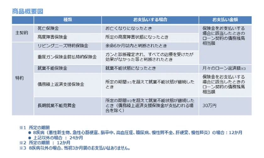SBI生命の団体信用生命保険の主な特長は次のとおりです。(1)死亡リスクに備える通常保障部分に、リビングニーズ特約、重度がん保険金前払特約が付加されます。(2)病気やケガのリスクに備える「全疾病保障」*の就業不能保障特約において、就業不能状態が継続した場合に、月々の返済額が就業不能状態の期間に応じて保障され、就業不能状態が一定期間継続した場合に、残債が一括で保障されます。中でも、がん、急性心筋梗塞、脳卒中など8大疾病の場合はもちろんのこと、それ以外の疾病やケガにつきましても、手厚い保障が提供されます。(3)この全疾病保障の加入年齢制限は65歳までと幅広く、年齢の高いお客様にも全疾病保障の魅力をご享受いただけます。(4)ワイド団信(引受基準緩和型団信)を導入することで、持病をお持ちのお客様でも、一部お引き受けすることができるようになりました。