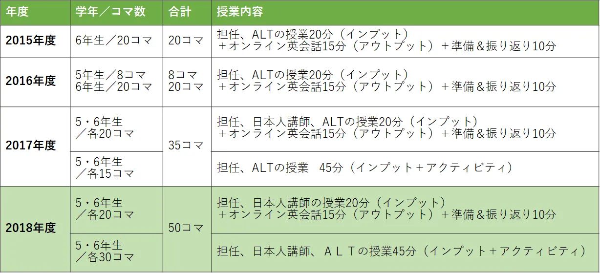 2018年3月に本年度のオンライン英会話事業者の選定を行い、昨年に引き続きレアジョブとの業務委託契約を締結しました。次期学習指導要領で小学校5、6年生向けの外国語の授業が35コマから70コマへ拡大することが定められている中、今年度は移行期間として、6月より両学年における授業数を各計50コマへ拡大して実施します。これに伴い、担任とALT(外国語指導助手)及び日本人講師が担当する授業は週1コマ45分間独立して行い、それとは別に担任と日本人講師によるオンライン英会話のレッスンを導入する形に変更します。担任、日本人講師、ALTの授業と、担任、日本人講師[福田泰司1] +オンライン英会話レッスンの授業を組み合わせることで、将来的な70コマ実施へのスムーズな移行と、児童が英語を好きになり、かつ、4技能をバランスよく習得できる公立小学校における効果的な英語習得のスタンダードモデルの確立を目指します。