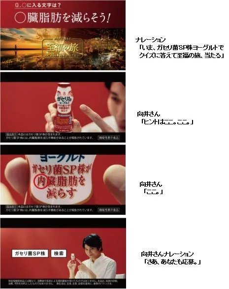 「ガセリ菌SP株が内臓脂肪を減らす」と大きく書かれた、商品パッケージの赤を意識した真っ赤な世界で、向井理さんが『恵 megumi ガセリ菌SP株ヨーグルト ドリンクタイプ』を手に取り、「内臓脂肪を減らすガセリ菌SP株」と紹介します。ナレーションによる「いま、ガセリ菌SP株ヨーグルトでクイズに答えて至福の旅、当たる」というキャンペーン告知と共に、旅先の画像が出現します。商品のパッケージを指さしながら、「ヒントはここ。ここ。ここ。」とクイズヒントをわかりやすく紹介する向井 理さん。最後に商品を一口食べ、「さぁ、あなたも応募。」と応募を促します。